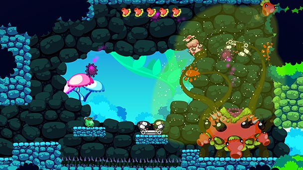 To avert tedium, the development team at Extend Interactive (A.R.E.S.: Extinction Agenda, Panthera Frontier) adds additional nuances. Color-coded fruits endow your clones with different aptitudes, allowing players to do things like add elasticity to your stone platforms or even redirect enemies who generate ability-blocking fields. Naturally, there’s often a downside, so that players can’t perpetually depend on these talents. When shunting the aforementioned jammers, your Mes give off light, acting as a beacon to nearby foes. Undeniably, the most gratifying element of So Many Me comes from the game’s gene splicer, which give players access to oversized objects that Filo and his replicas can ride. One of the first ones that players encounter is a Jellysaur who trades maneuverability for the ability to bat away irksome opponents like a grouchy Godzilla.
