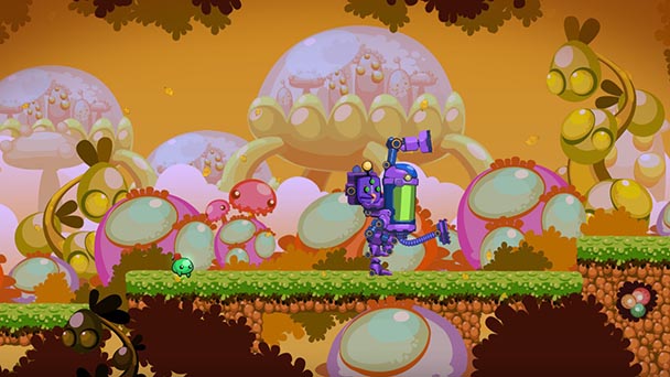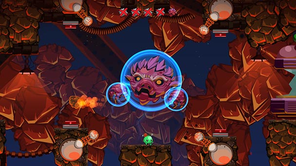 Initially, uniting with your duplicates (called “mes”), allows them to assiduously shadow Filo, as he traverses environments littered with the requisite bottomless gaps and series of spikes. There’s also the occasional animated adversity, in the form of smaller foes which can be dispensed with a well-aimed Mario Bros. style head bop. Turrets are another form of danger, but their sporadic fields of deadly fire can usually be circumvented with a well-timed dash.