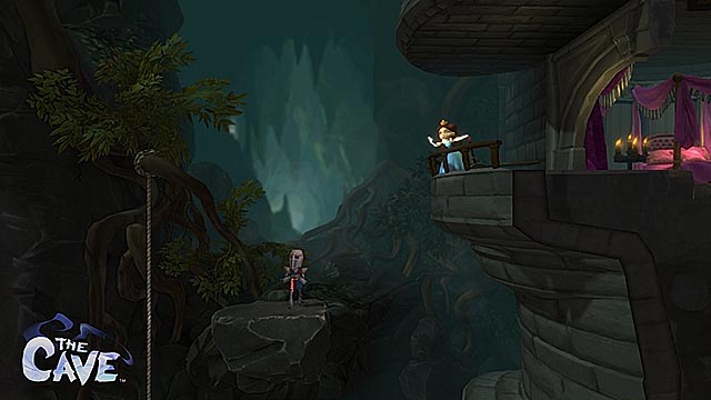 Navigating through the subterranean environment is accomplished with the left stick, with characters able to jump and pull themselves up from ledges. The later was likely added to temper The Cave’s half-hearted physics modeling. Not only does jumping feel floaty, but there’s a micro-second delay between a button press and the initiation of a leap as well as persistent framerate flutter. Remarkably, there’s a noticeable lack of action-oriented risk in the game, with perilous drops merely resetting the character without penalty. Coupled with a large quantity of backtracking, skulking through The Cave’s locales grows tedious. While it’s commendable that developer Double Fine aspired to make travel more interesting, the title fails to capitalize on its ambitions.
