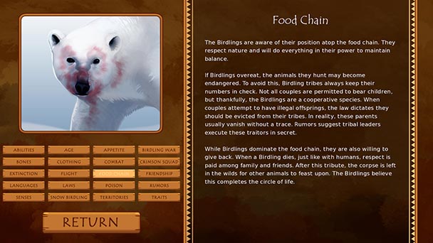 That kind of thoughtfulness extends to a few of The Last Birdling’s other components. At any time, players can delve into a glossary that offers details description of the game’s rich lore. Another enjoyable element is the novel’s interface, which allows readers to automatically advance the story at varying speeds and well as backtrack to review a missed line of dialog. With twenty-four save slots, readers have the ability to record their progress at every key juncture.