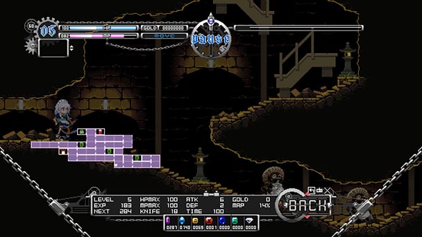 Occasionally, you’ll want to refrain from flinging blades into foes. In keeping with Touhou tradition, you can graze enemies, permitting them to come perilously close so they’ll emit fragments that can refill your health and magic power. Given that adversaries respawn when revisiting areas, you can easily exploit this trait, mining health and magic from encroaching enemies before darting offscreen and then repeating the process. But save for that final boss battle, challenge is Luna Nights is rooted in the small navigational puzzles rather than exchange of blows that conventionally drives combat in the genre.
