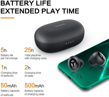Manufacturer claims about battery life are habitually overstated. Tranya asserts the 50 mAh Rimors have a five-hour battery life per single charge and a 25-hour playtime when used with the 500 mAh charging case. Naturally, there are a lot of variables than can affect those figures, from volume level to the distance from your broadcasting device. But largely, the peripherals come close to the claims with an average single-charge duration of 4 hours and 38 minutes across five tests. The process of charging is fairly swift, with power-depleted earbuds rejuvenating after 58 minutes while the case took 1 hour and 50 minutes for a complete recharge. If you’re in a real hurry, ten minutes of USB-C charging can supply at least 70 minutes of music.