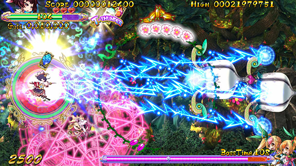 While each of the game’s twelve playables have their own distinctive weapon, Trouble Witches’ signature mechanic is the inclusion of an in-stage shop system. After earning currency by gunning down foes, you can do a bit of shopping for Magic Cards. Each of these sits in your spellcaster’s satchel, until they’re unleashed on enemies. When activated, you might get reflective R-Type-style lasers, a wave attack, a wide shot, or even vertical beams that can repel both opponents and their projectiles. Best of all, there’s a bit of eccentricity in these temporary sub-weapons, which injects quirkiness on the lower difficulties and help you survive if you choose the fourth and topmost challenge setting.