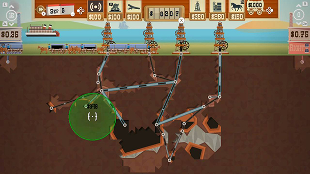 After placing the towering wooden derrick, you’ll begin the drilling process. Using the Switch’s analog stick, players lay down a path through the earth. If you’re lucky, the route will reveal orange dirt which signifies that a patch of crude is adjacent. Putting a pipeline in one of these reservoirs results in a satisfying slurping sound and visual representation of oil traveling up the pipeline. Of course, you’ll need carriages to transport the petroleum to the two companies with headquarters on the far sides of the playfield. Since offered prices constantly shift, you can also build a tank to store a limited amount of crude until prices inch back up. Any game that makes you feel like the tyrannical Aunty Entity in Mad Max: BeyondThunderdome is doing something right.