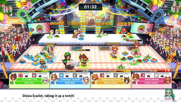 Gourmet Gauntlet challenges each horsegirl with stacking up food for their partner to eat. Plates are color-coded, so combos are rewarded and there are a few mechanics that let the girls hamper their competitors. While it’s intended to be chaotic, reading crowded areas, where multiple player and food sprites pile up can be difficult. Likewise, Hurtling Hurdles offers a lane-based, obstacle and power-up filled hoof-race. In theory, the stamina management mechanic might seem like a promising idea, but with only a single course, Hurdles’ fun lasts about as long as a five-furlong heat.