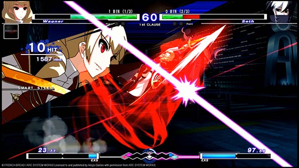 But before venturing into a confrontation, a quick trip to the game’s training mode might help to understand some of its mechanical nuances. While there’s plenty of fighting game convention, with the customary health bars and EXS meters which regulates the special attacks that complement every character’s unique repertoire. But peer between each combatant’s EXS bar and you’ll spy Under Night’s most transformative mechanic, the Grind Grid.