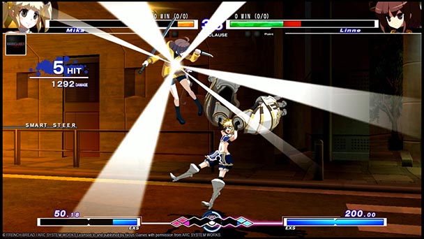 Visually, the game makes for a proficient port, although there a few minor blemishes are apparent. Wholly, character design is spotless, extending characters like Nanase, a nimble sword-carrying schoolgirl with a mobile phone fixation or Waldstein, a hulking, hairy man whose carries humungous gauntlets. Whether players prefer speed, reach, or power there’s a combatant to be found, and with the game’s consistently fluid animation and delicately-drawn details, it would be hard to not be enamored by at least a few fighters among the cast of twenty. Pleasingly, the game’s four new additions mesh exceedingly well, avoiding the feeling of character redundancy. Unfortunately, the level of fidelity doesn’t apply to the polygonal backdrops, which can be sparse and flaunt only a modicum of movement. Musically, the game runs the gamut, so expect everything from J-pop, searing metal, and even a bit of dub-step to supplement the on-screen skirmishes.