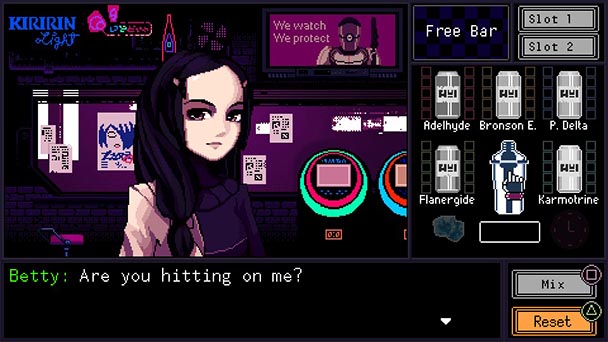 Most visual novels simulate interaction through dialog options, with characters seemingly responding to your selection. VA-11 HALL-A adopts an atypical approach, with your bartending have a large influence on interchanges. When a patron asks for a drink, you can effectively increase the amount of intoxicant. Unsurprisingly, upping the strength of the potable tends to make characters more loquacious, often leading to rambling outbursts that display their inebriated demeanor. But doing so might not deliver one of the game’s ‘good’ endings. Yes, unlike most VA’s which telegraph the outcome of every conversational choice, this game conceals the coding, making decisions feel organic and endowing replay with appeal.