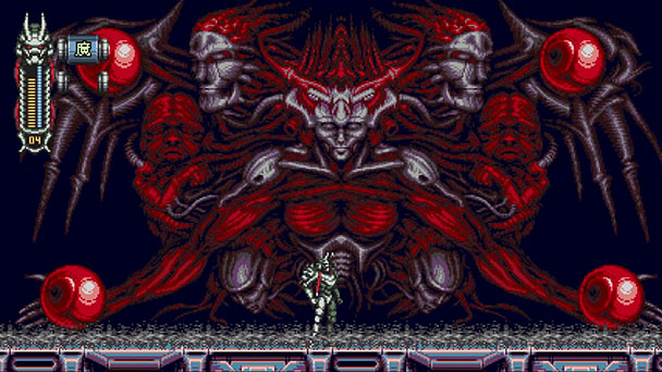 Stages evoke many of the masterworks of yesteryear, whether it’s the irksome robo-snipers in watchtowers that recall Contra and Metal Slug or the enemies with elongated mouths that elicit memories of days spent playing Decap Attack. Undoubtedly, you’ll need to approach Vengeful Guardian the same way, methodically memorizing the position of every danger and dispensing with a proper countermeasure. I fell into the age-old pattern of rapidly shifting between attacking and evading just like once did with Contra. But since competition time and scoring are used to calculate stage scoring, it’s probably not the best method to approach Moonrider. But hey, I relish annihilating every last threat. It’s what a rogue bioweapon would do.