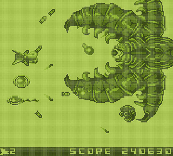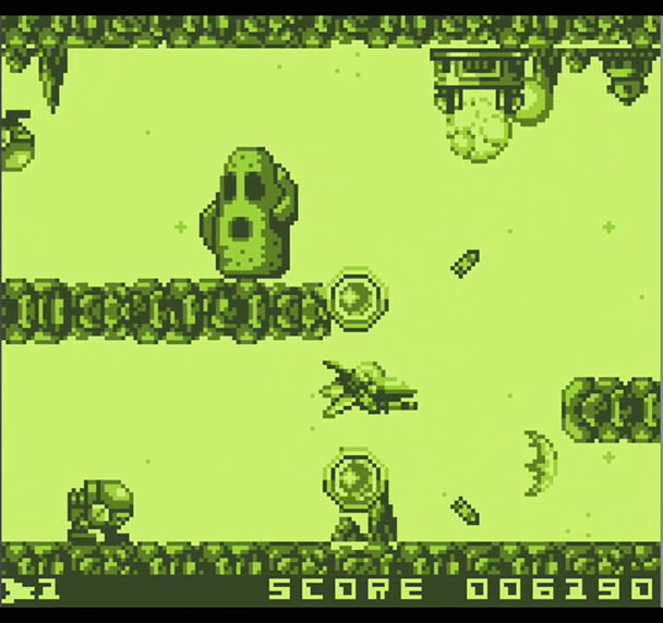 Undoubtedly, you’ll need that kind of flexibility. Verzeus seven stages are tough, even on the easiest difficulty setting. Each level tends to fill the simulated Game Boy screen with enemies, projectiles as you fly toward the end-of-stage boss. Sporadically, the game even introduces enemies from the left side of the playfield, goading you into staying near the center of the screen.
