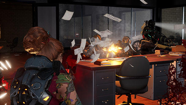 These kinds of firefights are most exhilarating when you’re working the angles, pouring hot lead into the prone side of oblivious foes. But Wanted’s opponents are constantly scurrying around erratically. Not only do their actions look completely unrealistic, but targeting the darting enemies isn’t enjoyable. Woefully, your allies tend to do the same, seemingly hunting down opponents but never really doing much damage. Given the game’s fondness for murky lighting, firefights devolve into crowds of similar-looking combatants who all run around for no good reason. Apparently, this is when you’re supposed to use the game’s Adrenaline Shot, prompting Stone to shoot elusive enemies around her, setting things up for a succession of finishers.