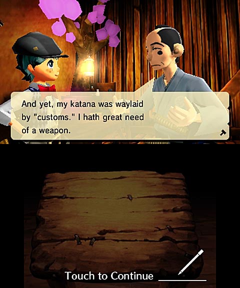 Although conversations might intrude, they contribute to Omasse’s puckish attitude. During your internship, you’ll get to know a number of regular customers, from a hapless samurai, a bullish Frenchmen, and a grandmother who had a hard time wrapping her head around has hashtag usage. Yes, Weapon Shop includes a Twitter-esque feed called the Grindcast, where characters skewer role-playing tropes and offer a bounty of videogame send-ups. Considering that the game was written by comedian and comic artist Yoshiyuki Hirai, it’s hardly surprisingly that the game’s dialog is habitually humorous- but players who don’t to read reams of text may get turned off. Expectedly, Level-5’s translation is spotless- while adapting wit can be difficult, the localization team did a commendable job.