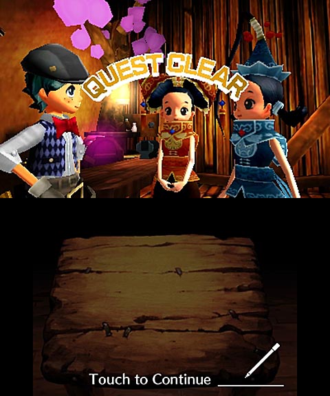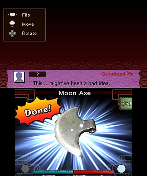 After entering the weapon shop, each patron will give players a specific order, requesting items such as axes, shortswords, and spears to be crafted. The creation of these weapons is handed at the game’s forge, with players striking a searing piece of molten metal in time to a musical selection. Not only must gamers correctly match the cadence of a tune, they also must simultaneously chip away at excess metal and keep an eye on the item’s temperature. Success in each area improves the quality of the weapon, which in turn improves a hero’s chance for success. Should an adventurer fail due to faulty equipment, the weapon shop can’t collect payment, and becomes a bit more removed from smithing the ultimate weapon that’s capable of eradicating the Evil Lord.