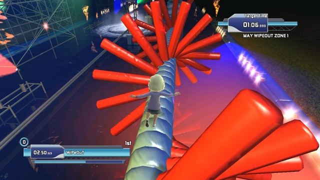Although the title allows players to jump right into either single player mode or multiplayer competition, training in the game’s practice mode is highly recommended. While many of the In the Zone‘s movements ask gamers to replicate real-world actions such as walking, running and jumping, a few unintuitive commands exist. Two outstretched arms halts your avatar, while holding that gesture makes the player backpedal. In execution, the signal sporadically takes a second to be recognized by the game, which often results in the players being flung off the course by the slightest graze of a giant obstacle. Unlike the television program, avatars rarely attempt to save themselves. Giving the player a second chance certainly would have reduced Wipeout‘s frustration factor.