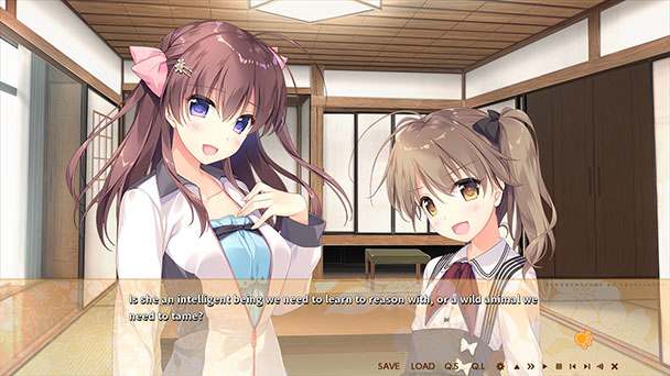 What follows is plotline that moves at a surprisingly quick pace. Other novels might have dawdled over the decision to bring her home, but How to Raise a Wolf Girl squanders little time. After feeding her, the family decides to give her a bath, which would have been a customary opportunity for some fan-service or at least a bit of lascivious banter. That’s not to say that the game isn’t afraid of lascivious, you can romance either Kana, or Iroha, the wolf girl with a R18 patch from Denpasoft showing a bit of mosaiced skin across five sex scenes. Say it with me, “Awooo!”