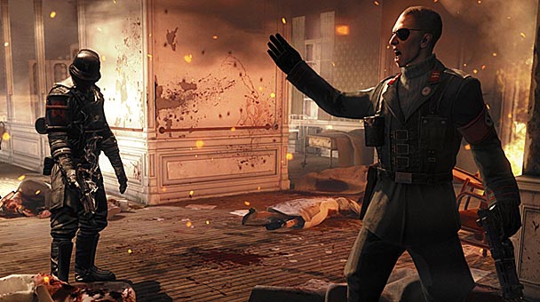Last year, before publisher Bethesda Softworks allowed the press to get their hands on a single stage demo, they established the game’s timbre with one of the game’s key cinematics. Recalling the punchy dialog and dark humor of Quentin Tarantino’s oeuvre, the sequence exhibited an interrogation of franchise protagonist B.J. Blazkowicz conducted by a female S.S. office. With a Luger up for grabs situated between the two characters, and a boy-toy assistant flanking the older Nazi, the scene fused intensity and levity, suggesting that The New Order was channeling the Nazi-revenge fantasy of Inglourious Basterds. The succeeding playthough revealed a competent, yet derivative shooter, where players battled a robotic dog and concluded with a fire-fight in a room occupied by a massive moon model. All the while, Blazkowicz would issue his trademark punch lines, indicating that Wolfenstein wasn’t going to take itself too seriously.