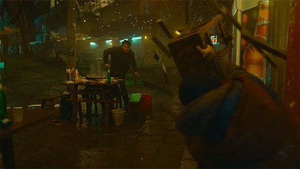 There’s a glimmer of hope when Guan climbs atop a hill, poised to target a truck driven by two human traffickers. A fight ensues, the bag guys escape, and Guan is arrested when the police arrive. But much like Trinity in The Matrix, assistance arrives when a young woman helps the protagonist make a quick escape. Here, the protagonist learns of another, separate world connected to our own.