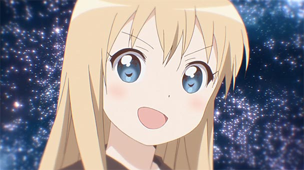Mirroring the series’ light-hearted approach to plot, YURUYURI’s opening episodes offered a breezy introduction to the affable foursome. With vibrantly-hued red hair worn odango-style, Akari Akaza would seem to implore attention, yet the running joke is that her unassuming personality often renders her invisible to others. Nose bleed-prone Chinatsu Yoshikawa has a similarly charming coiffure with fluffy pink pigtails which ravenously consumes small objects. Meanwhile, Kyōko Toshinō is the anime’s requisite otaku, frequently drawing dōjinshi based on her favorite anime witchgirl, Mirakurun (who shares a striking resemblance with Chinatsu). With an amble supple of eccentricity, the enduringly rational Yui Funami represents the series’ tsukkomi, offering an oft-amusing counterbalance for the rest of the girls.