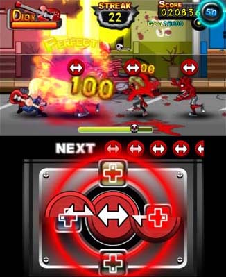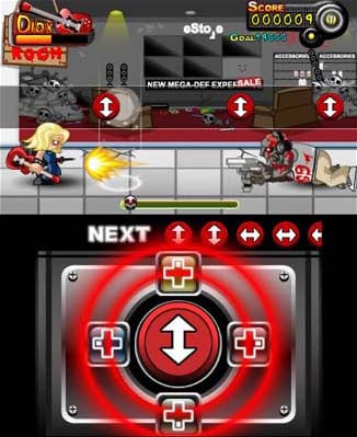 On the easiest challenge level, Zombie Slayer Diox requires gamers to duplicate the gesture shown atop each invading undead enemy. Obviously designed to mimic the plucking of guitar strings, an accurately timed swipe of the touchscreen launches at attack from the game’s eponymous character. On higher difficulty settings, zombies become color-coded, demanding players to press a direction on the D-pad in coordination with their simulated strumming. At first, doing both actions simultaneously feels completely awkward. By the game’s final thirty-sixth level, Diox is slightly less cumbersome, but never quite as instinctive as playing a plastic guitar. For southpaws, the game allows participants to alternatively use the 3DS’s face buttons to select colors.